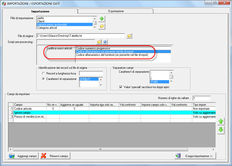 Quando crei un filtro di importazione in UTIL > IMPORTAZIONE / ESPORTAZIONE DATI devi verificare l'opzione indicata in figura: