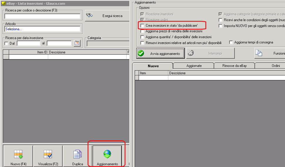 4) Quando hai 100,200,1000,10000 inserzioni "DA PUBBLICARE" apri la procedura di sincronizzazione e la avvii con l'opzione "Crea inserzioni in stato da pubblicare" attivata (vedi screenshot)