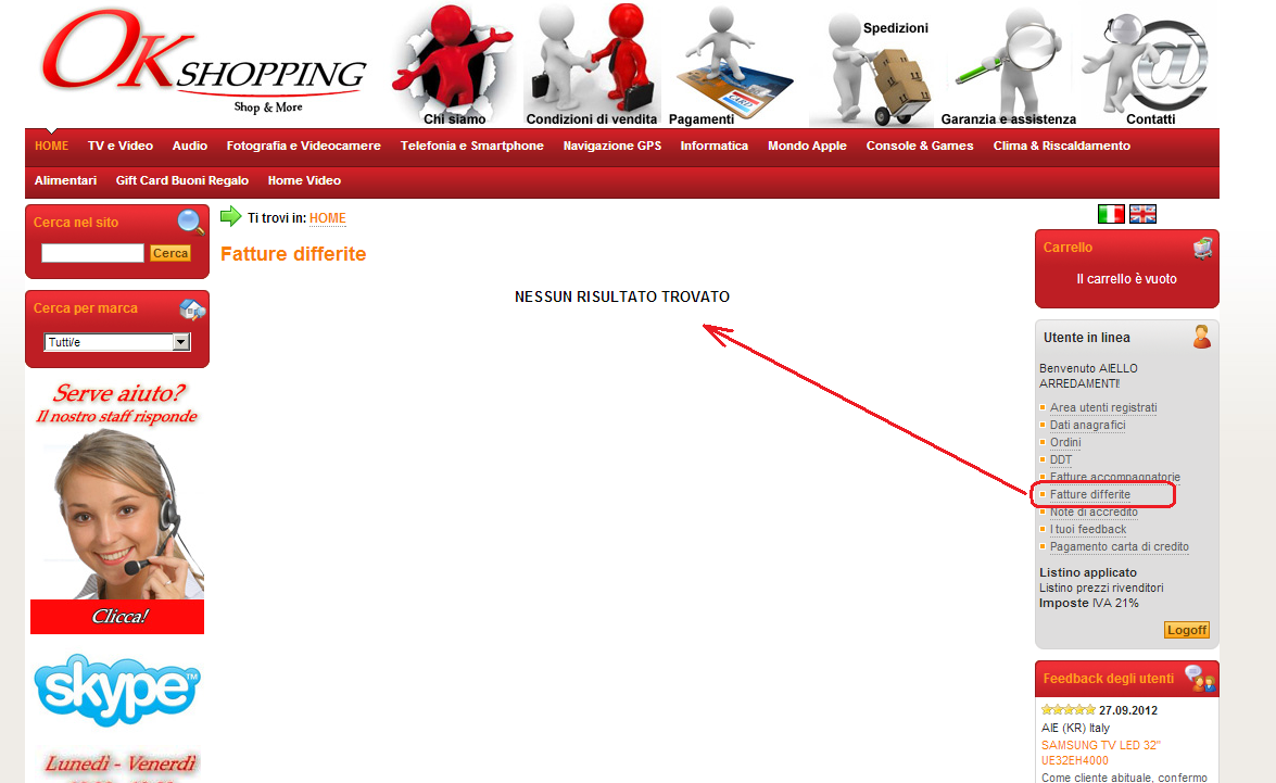 Salve, sul sito effettivamente le fatture di questo cliente sembrano non sono visibili. come si vede da questo screenshot