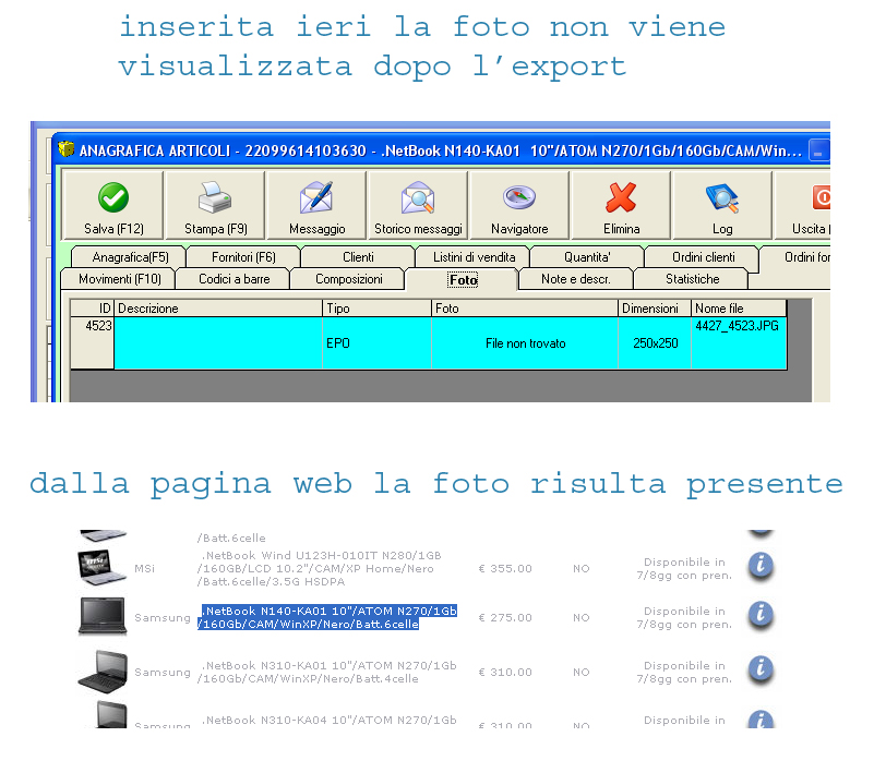 Citazione: sicuro che il tuo web master, una volta ricevuto il file con il nome e percorse delle immagini non le sposti Scusa Glauco, ma se anche il web master spostasse le foto sul web server questo non spiegherebbe comunque perche' le foto spariscono da locale. Evidentemente viene fatto qualcosa che qui non e' spiegato Forse l'unica soluzione sarebbe fare un intervento in teleassistenza per vedere esattamente quali operazioni vengono fatte