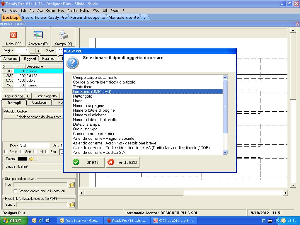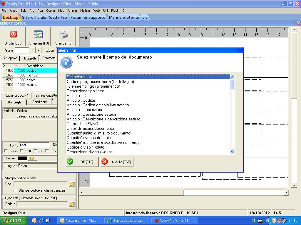Anche se in realtà effettuando la stessa operazione mi compare subito il campo "foto". Entro nel DDT di carico, premo su Stampa, seleziono "Stampa etichette degli articoli a corpo", premo "stampa", seleziono "Crea un nuovo formato di stampa" ed entro nell'editor delle etichette. Aggiungendo un nuovo oggetto mi compare "Campo corpo documento" e poi la lista dei campi, "Foto" compresa.