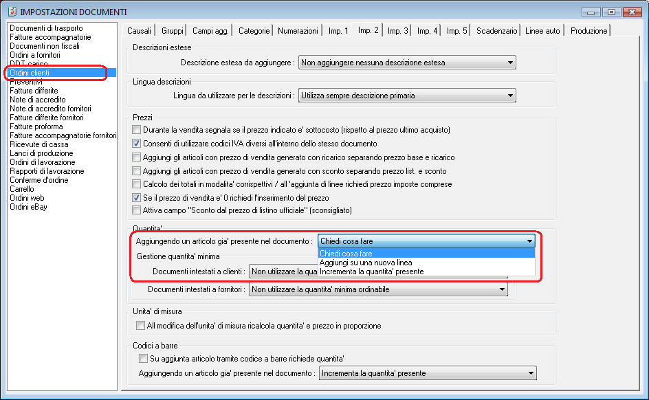 sto importando degli ordini cliente che mi arrivano su formato exel purtroppo posso solo importare codice, descrizione, quantità, ma spero di poter importare anche data di evasione o un campo "note" sul quale inserire i dati aggiuntivi che mi servono! (magari con i prossimi aggiornamenti!!!??) Nel momento in cui redigo un ordine cliente mi apro la finestra di ordini clienti, clicco "av" ed importo l'ordine. Quando inizia l'operazione mi compare una finestra che mi chiede di "aggiungere una nuova riga al documento" oppure di "incrementare una riga già esistente" perchè eistono più articoli uguali su righe differenti a seconda dell'evasione dell'ordine. Si può disattivare la comparsa di questa finestra e scegliere l'opzione di far aggiungere una nuova riga al documento? Mi accade infatti che se ho 30 articoli che si ripetono la finestra mi compare per 30 volte e rallento l'operazione di import dell'ordine!!