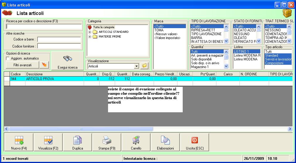 Mi spiego meglio: finora ho utilizzato un foglio exel sul quale ho inserito i miei articoli uno per ogni riga e le diverse fasi di lavorazione, le date di evasione e varie caratteristiche sulle colonne. Il numero degli articoli attivi si aggira intorno a 500 perciò due volte al mese, quando mi arrivano gli ordini dai clienti, inserisco le date di evasione e con i filtri riuscivo ad individuare quello che dovevo produrre a seconda della data, poi continuavo a filtrare questi articoli già selezionati a seconda della tipologia di lavorazione,ecc.. Per avere tutte le informazioni che avevo sul mio foglio exel ho creato nella lista degli articoli una visualizzazione pari pari a quello che avevo su exel, e l'unico dato che mi manca sono le date di evasione che sono il primo filtro per poter andare avanti con la mia selezione di articoli.