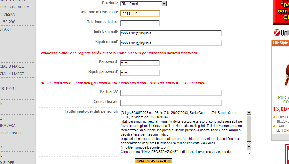 Allora l'errore dev'essere legato a qualche problema diverso, al 99% direi che non puo restituire un errore solo perche' il cliente si e' registrato come xxxxxx1201@virgilio.it