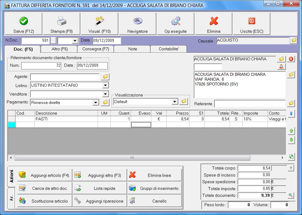 Esempio devo registrare una fattura di euro 9,40 cioè 8,55 di imponibile più 0,85 di iva.