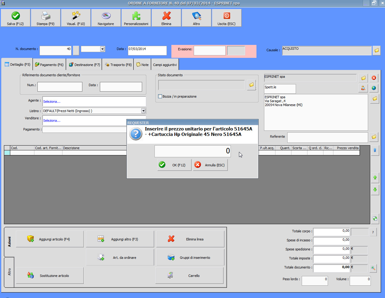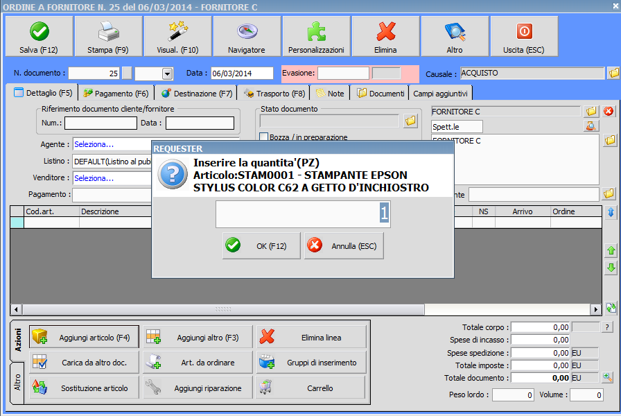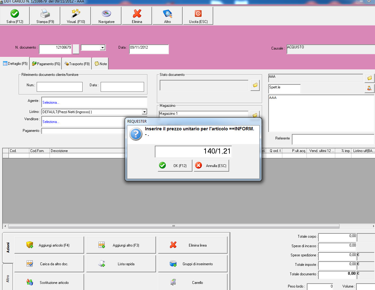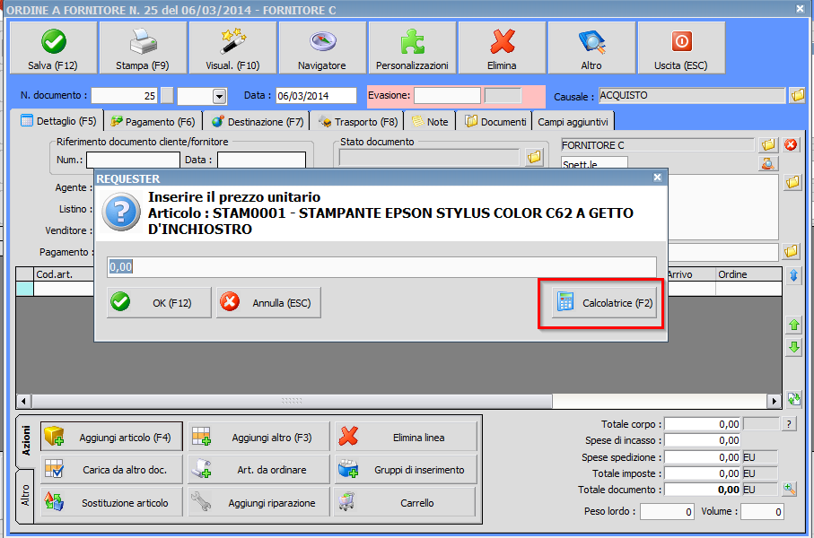 F4 per l'inserimento di una nuova linea seleziono l'articolo da inserire il REQUESTER mi chiede la quantità e la confermo con F12 il REQUESTER mi chiede il prezzo ... e qui mi aspetterei di vedere lo shortcut della calcolatrice F2 che non viene proposto per default (posso visualizzarlo solo se vado successivamente a cliccare sul prezzo per variarlo, allora mi si apre il REQUESTER con l'opzione per la calcolatrice)