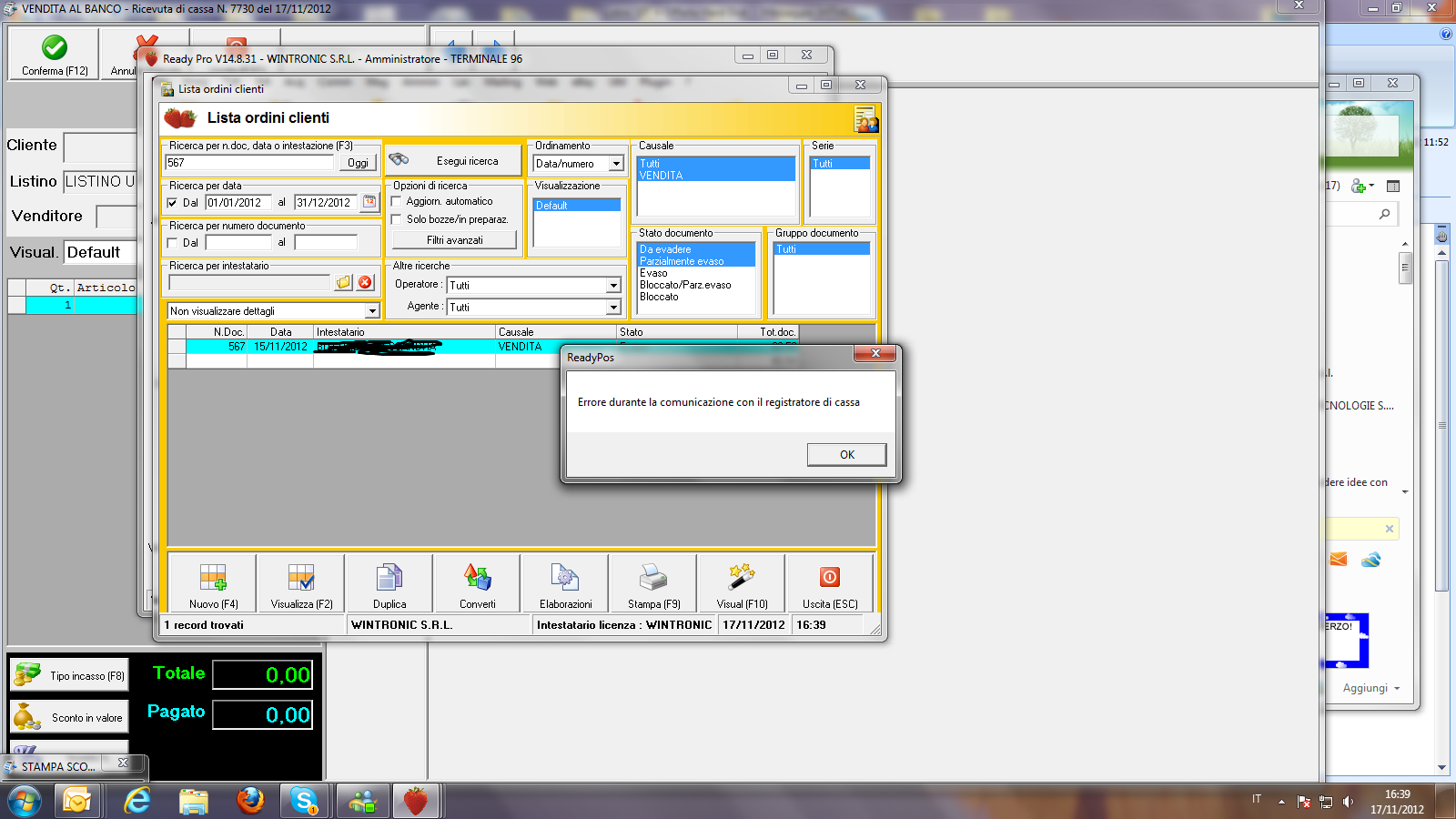 Buongiorno, ho un problema con il registratore di cassa (problema che non si presenta sempre ed è questo che non riesco a capire) quando inserisco uno sconto in valore mi appare l'errore che potete notare di seguito. In questo caso ho convertito un ordine in scontrino, poi ho inserito lo sconto in valore e mi è copmporso l'errore. L'unico dubbio che mi è sorto e che tale problematica potrebbe manifestarsi con sconti superiori a un certo valore in euro, perchè con importi piccoli va tutto ok. La versione utilizzata di ready è la V 14.8.31