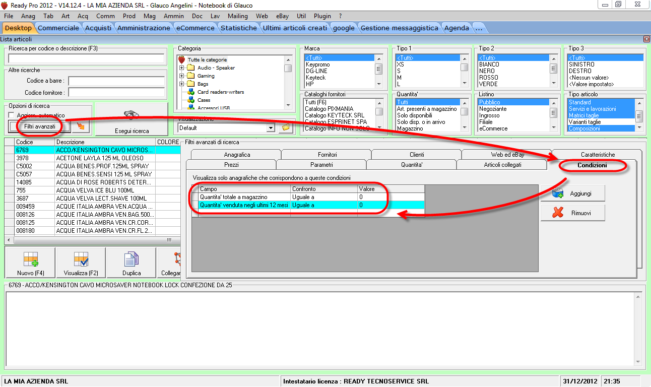 Citazione: potrei in qualche modo cancellare in modo automatico tutti gli articoli che non vengono movimentati da un tot di tempo (ad esempio da 2 anni)? Ti mostro un esempio di filtro che potresti adottare. Tramite i campi standard di Ready puoi escludere quelli non più movimentati nell'arco di 12 mesi. Se vuoi esattamente 2 anni dovremmo realizzare uno script