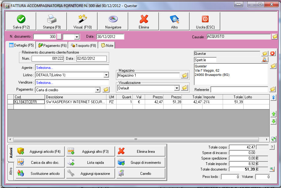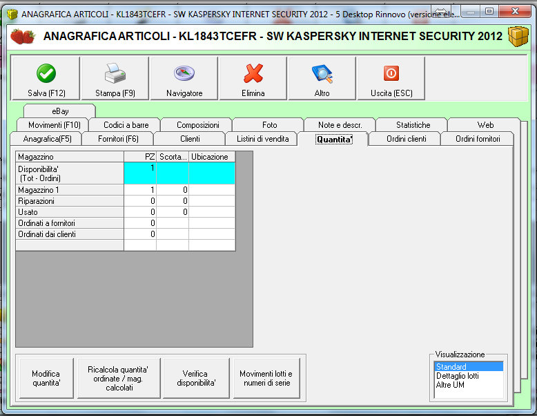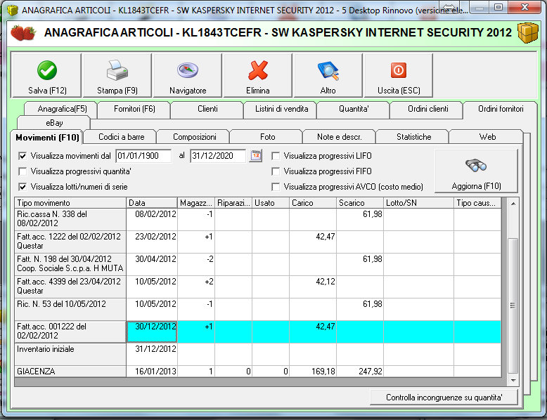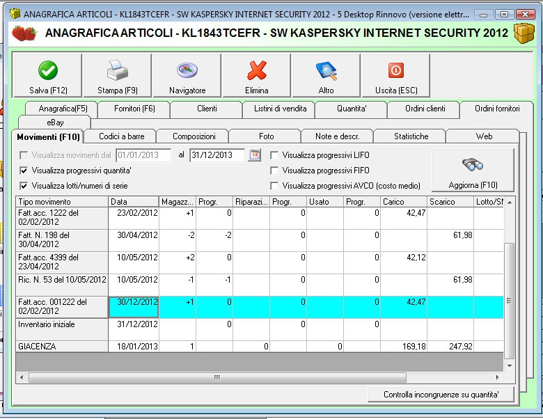Allora...provo a spiegare meglio: Il 31/12/2012 ho caricato delle vecchie fatture che mi erano rimaste in sospeso, poi ho creato un nuovo inventario di magazzino azzerando tutte le quantità. Successivamente ho fatto l'inventario inserendo le quantità di tutti gli articoli presenti a magazzino e a fine inventario stampando la valorizzazione al 31/12/2012 mi accorgo che risultavano presenti oltre agli articoli inventariati anche gli articoli presenti nelle fatture caricate il 31/12/2012. Dietro vostro consiglio ho provveduto a datare le fatture incriminate al 30/12/2012 e adesso la valorizzazione al 31/12 viene stampata correttamente. Il problema rimasto è che io ho giacenza di magazzino di quegli articoli!  Per capire allego gli screenshot di uno degli articoli, in particolare lo screenshot del carico della fattura di acquisto, i movimenti dell'articolo (ho lasciato evidenziata la riga di carico articolo che ha data 02/02/2012 ma inserimento il 31/12/12) e infine le quantità che come potete vedere indica 1 a magazzino nonostante sull'inventario di magazzino non siano stati caricati.