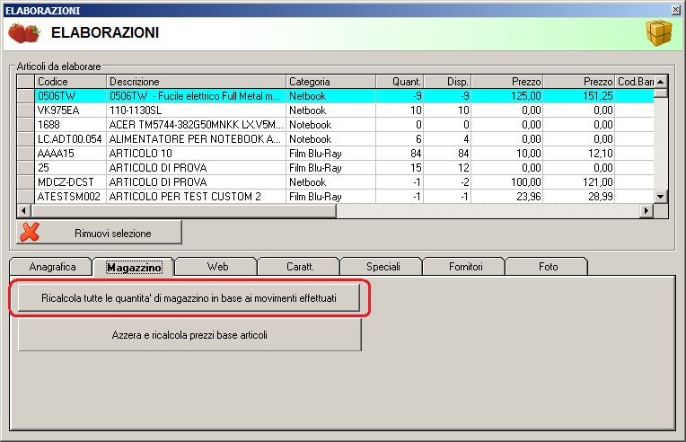 Puoi ricalcolare tutto da LISTA ARTICOLI / ELABORAZIONI / MAGAZZINO / RICALCOLA QUANTITA'