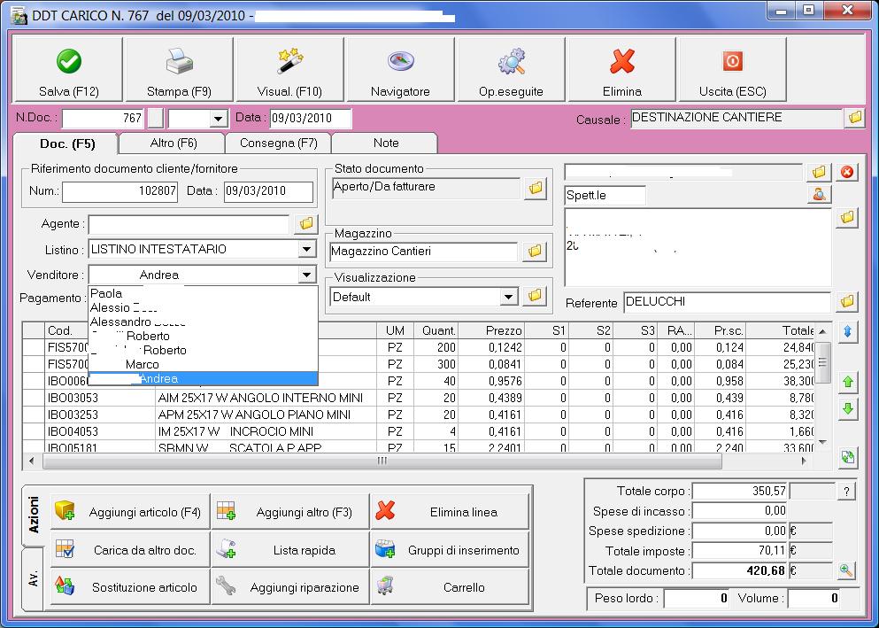 Le carico con la nota "manca" in modo da poterle richiamare più facilmente ed in più, se sulla bolla non è indicato il cantiere, indico come venditore il nome di chi ritira la merce (i nostri fornitori hanno l'obbligo di indicare il nome di chi ritira il materiale la banco).