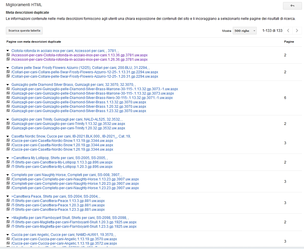 Scava, scava, vedo che google webmaster tools mi indica: - 94 meta descrizioni duplicate - 289 meta descrizioni brevi - 88 tag title duplicati