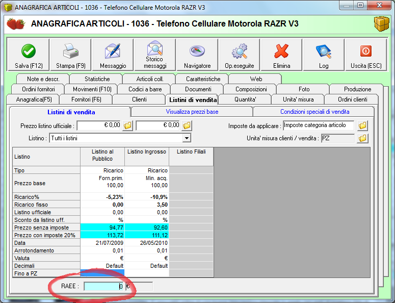Mi vengono in mente solo due possibili soluzioni: - Gestire il PREZZO BASE + PREZZO DI VENDITA sugli articoli - Utilizzare il campo RAEE