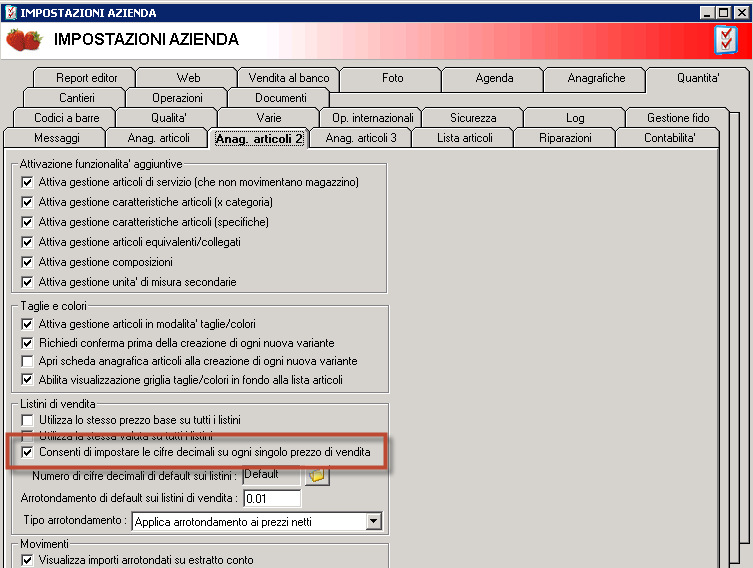 Ciao, inizialmente da impostazioni azienda ho messo in impostazione articoli 2 solamente 2 decimali, poi mi sono accorto che per alcuni articoli mi occorrono almeno 3 decimali, allora sono tornato su impostazione articoli 2 ed ho messo 3 decimali, purtroppo nell'anagrafica dell'articolo quando vado a modificare il prezzo mi continua a mantenere 2 decimali invece che 3 se creo un nuovo listino mi permette di impostare il prezzo a 3 decimali, non vorrei ricreare l'anagrafica di questi articoli perché sono una marea.