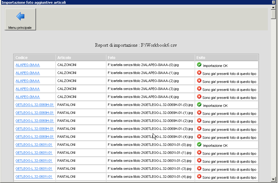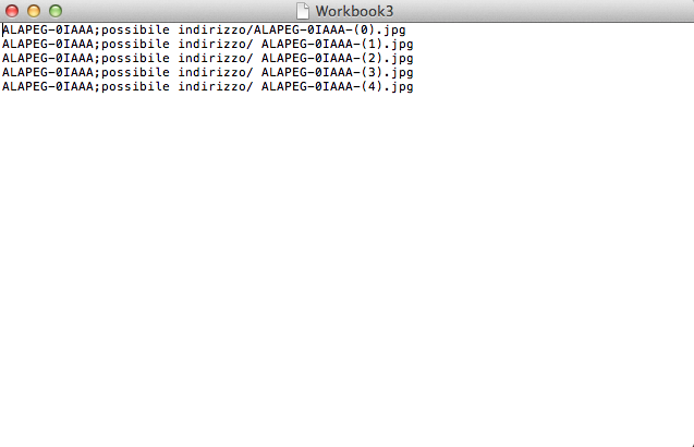 2) Avendo circa 400 foto (5 per ogni articolo matrice) vorrei un consiglio per come procedere nella creazione del file CSV; io ho fatto così: