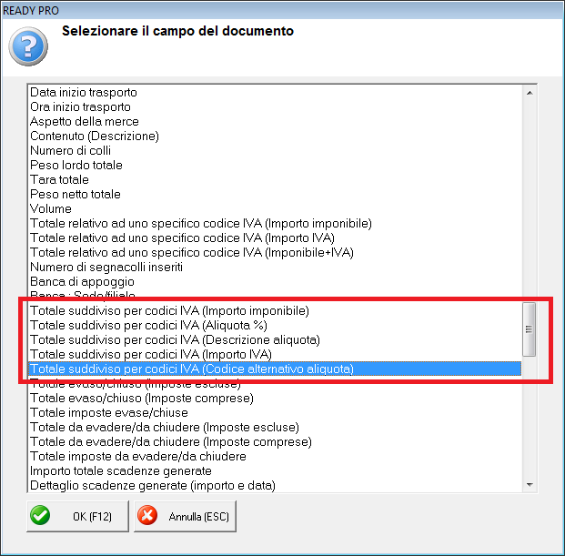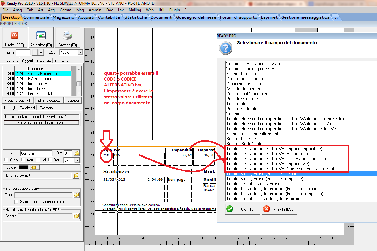 Il mio scopo è riportare il "codice alternativo imposte" in ciascuna riga dei miei report di stampa. Nel piede del report andrò quindi a fare una tabella di riepilogo codici iva/descrizioni/imposte/imponibili etc.