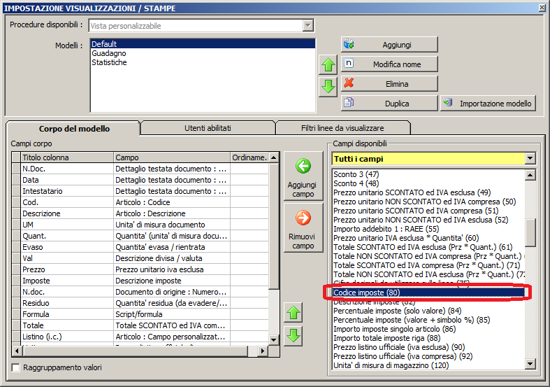 Essendo questa ultima cosa già possibile, presumo sia facilmente fattibile inserire nella lista dei campi visualizzabili anche il codice alternativo delle imposte.