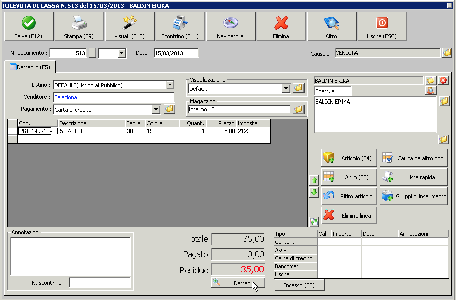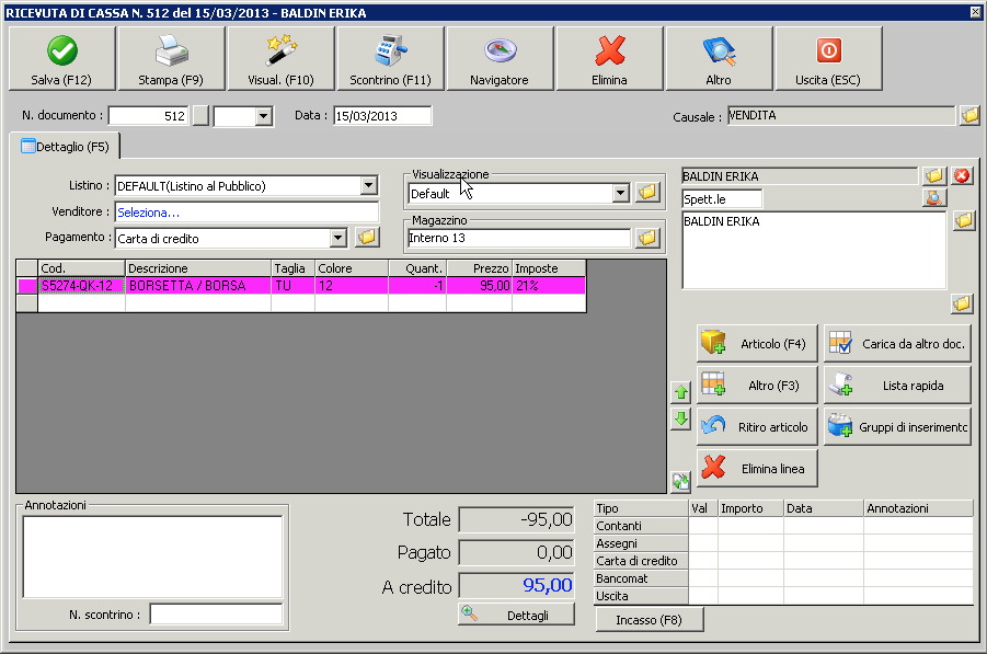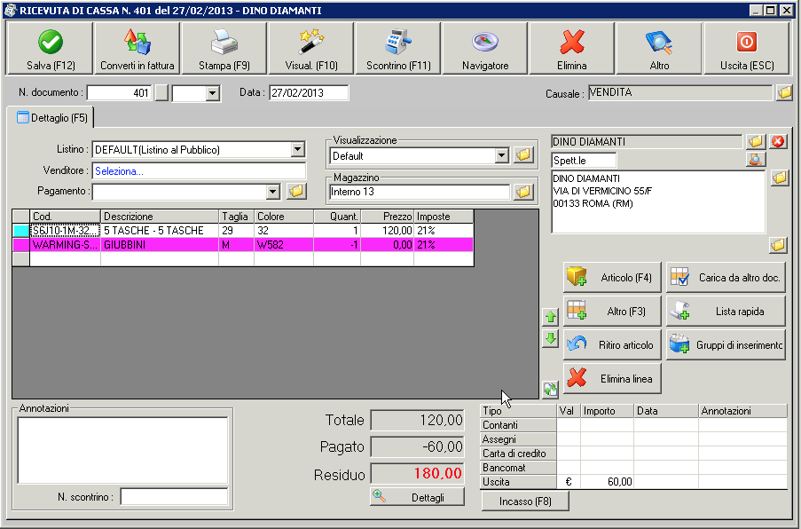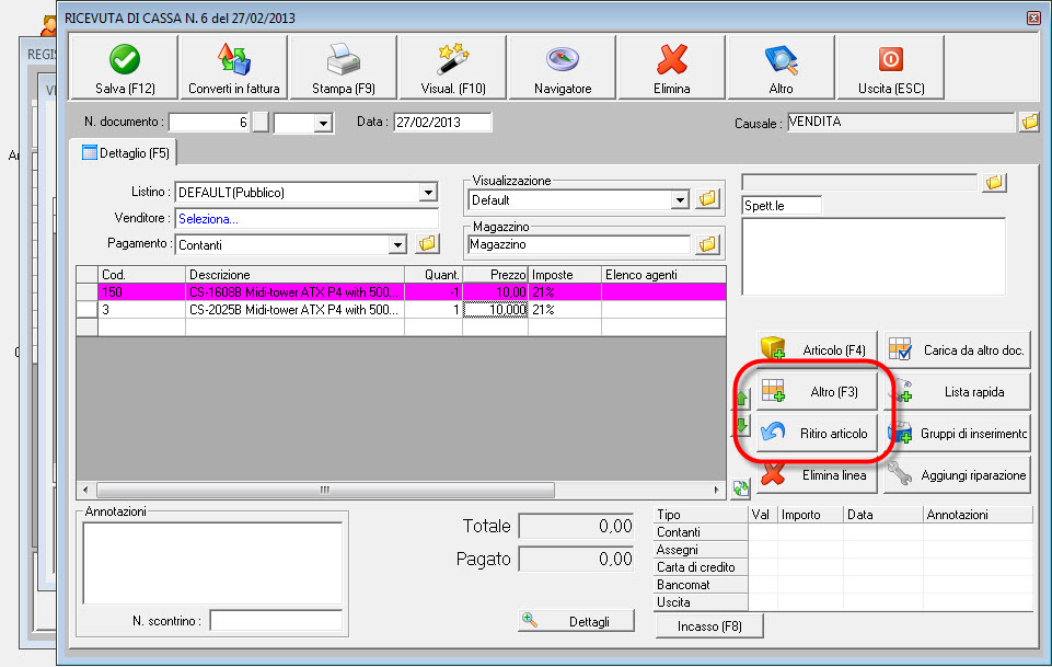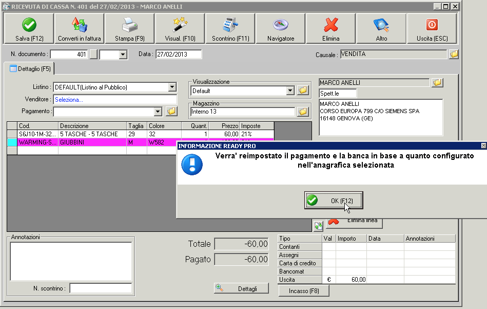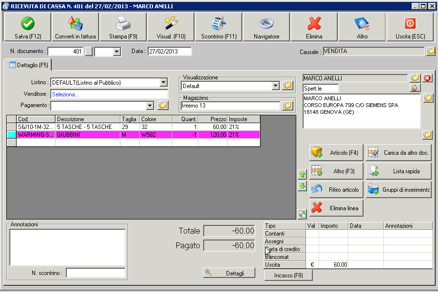 - Creato una nuova ricevuta cassa,intestata al cliente e ho ritirato l'articolo al prezzo dell'acquisto,selezionando la modalità di pagamento dell'acquisto (screenshot 1)
