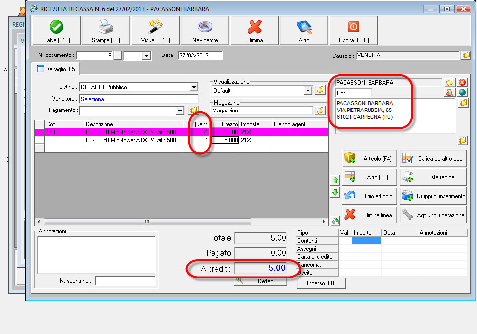 Citazione: perchè magari non tutti vogliono essere registrati Immagino, spero, che non tutte le vendite si concludano con un reso. Si tratta quindi di creare l'anagrafica cliente solo nel qual caso si debba stampare un BUONO DI SPESA.  Anche perché altrimenti come fai a sapere chi ha un credito? Inoltre fiscalmente non credo sia corretto.