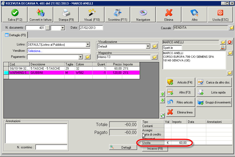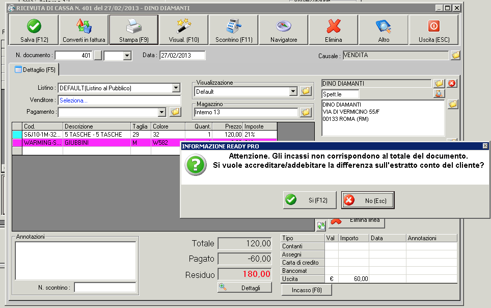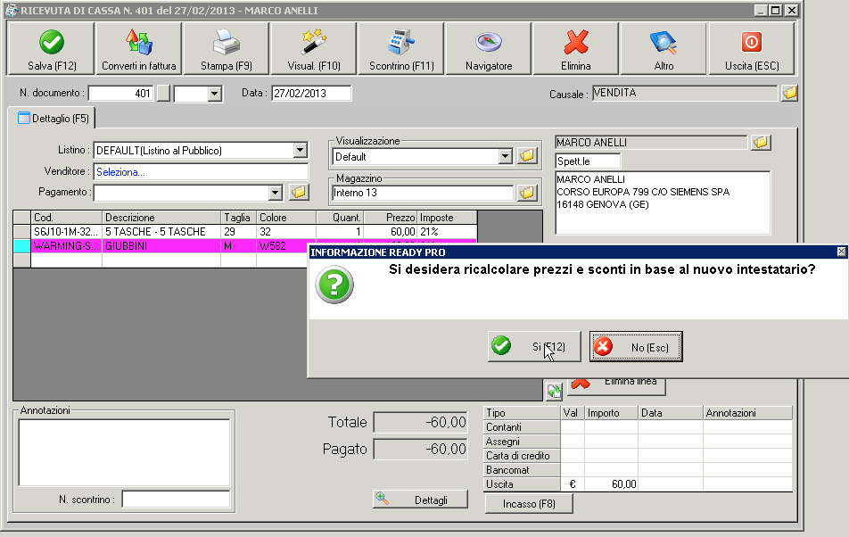 5) Cliccando SI il risultato è questo (screenshot n 5) Dipende cosa vuoi fare e il messaggio mi pare chiaro.  Visto che ormai l'errore è stato fatto io avrei risposto sempre NO ed al termine prima di salvare o stampare la ricevuta devi semplicemente RIMUOVERE (impostandolo a zero) l'uscita di 60 euro.