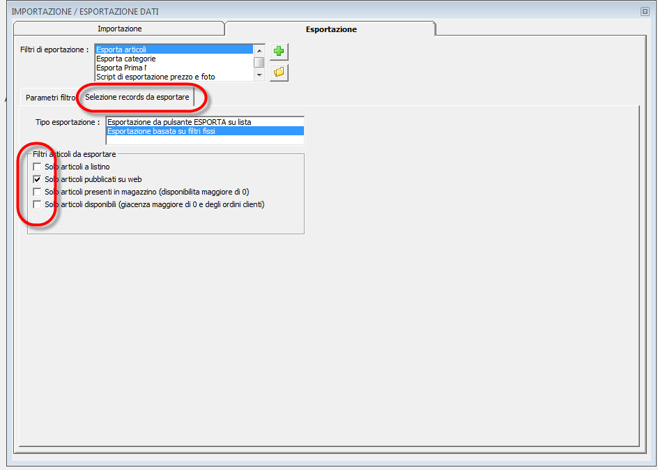 Citazione: ma come faccio ad esportare SOLO gli oggetti pubblicati sul web? Devi entrare nel tab SELEZIONE RECORDS DA ESPORTARE come indicato dal mio screenshot: