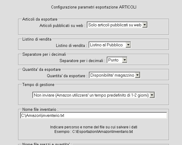 Citazione: una volta effettuata l'esportazione dell'archivio,copiamo gli SKU e le quantità degli articoli esportati in un foglio "quantità/prezzi" scaricato da Amazon,che poi carichiamo manualmente su Amazon In questi termini riesci tranquillamente a creare un filtro di esportazione anche tu tramite UTIL > IMPORTAZIONI/ESPORTAZIONI DOCUMENTI > ESPORTAZIONE.