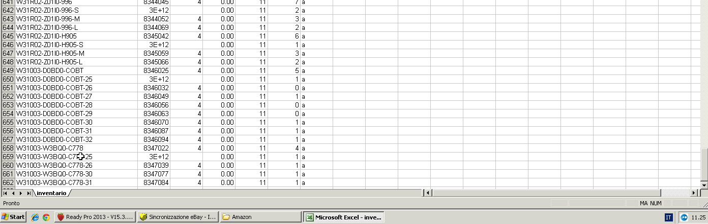 io al momento non inserisco nessun codice a barre,quello che si visualizza è quello generato da ready pro...io tramite lo sku aggiorno le quantità,il codice a barre non c'entra niente quando si devono solo aggiornare le quantità...serve solo per caricare nuovi oggetti