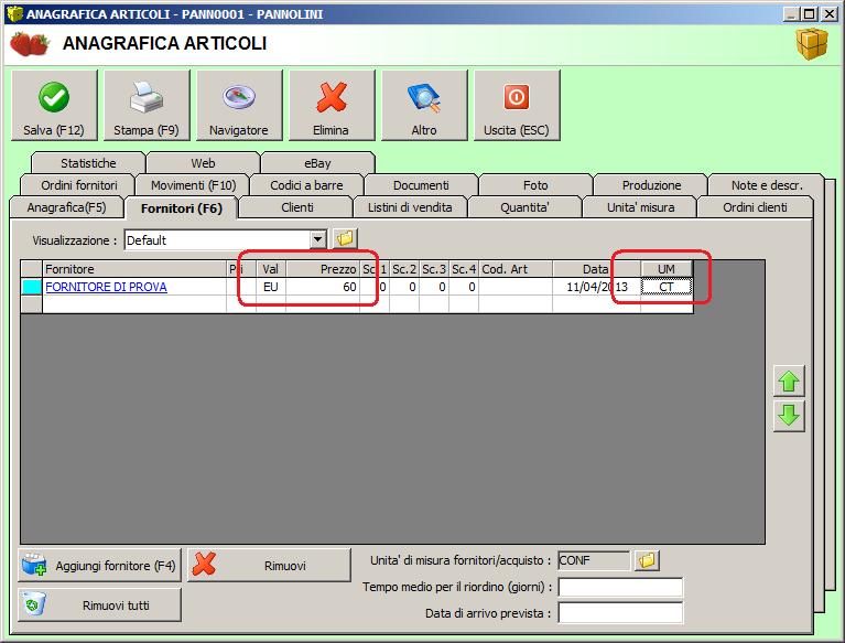 Citazione: La domanda è: qual'è la configurazione ideale lato fornitore? (prezzo e UM di acquisto?) Lato fornitore configura: Unita' di misura : cartoni Prezzo : 60 eu