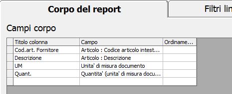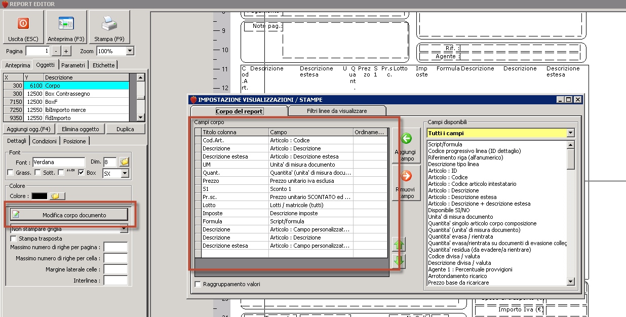 Puoi mostrarci uno screenshot del corpo documento nel report editor?