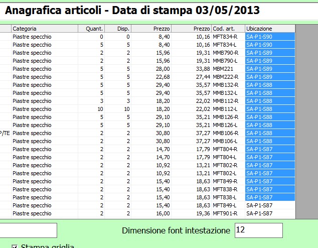 hai ragione, la colpa non è tua, spiegarsi così non è sempre facile. Io ti chiedevo se fosse possibile applicare questo tipo di stampa che si trova nella anagrafica articoli (vedi i passaggi nelle ultime due screenshot che ti ho inviato, stampa elenco in griglia e anagrafica articoli) anche alla stampa ordini clienti. Come ti dicevo le volte scorse, questo tipo di stampa (vedi secondo screenshot evidenziato in blu) è anche possibile metterla in ordine crescente o decrescente. Questa operazione, potrebbe tornare utile perchè così facendo, è possibile tirare fuori un brogliaccio ordinato per ubicazione che al momento della preparazione dell'ordine cliente, ti permetterà di passare davanti allo scaffale per preparare la merce una sola volta, anziche' fare avanti ed indietro più volte. Penso che questa stampa possa tornare utile un pò a tutti, spero di essere stato più chiaro nell'esposizione, resto in attesa di tue nuove.