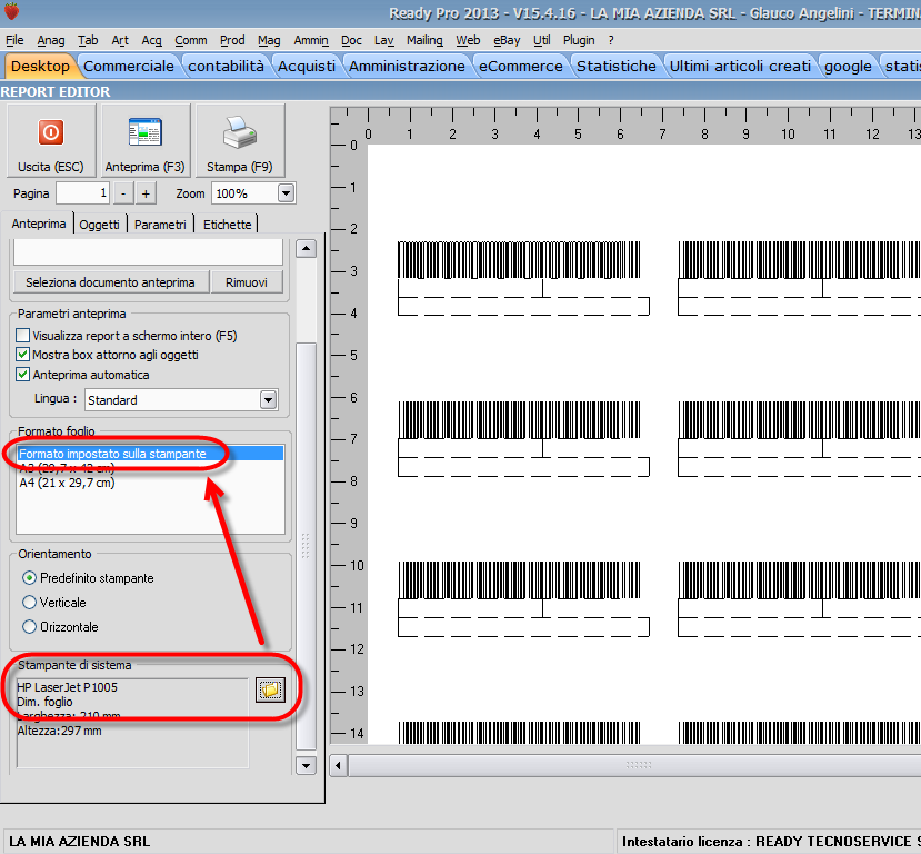 Ho configurato il report di stampa 5x2,5 cm e nel driver della stampante ho impostato come dimensioni di stampa 5x2,5 cm. Provo a stampare e funziona tutto bene. Mi stampa tutte le etichette uno dopo l'altra senza saltarne nemmeno una.