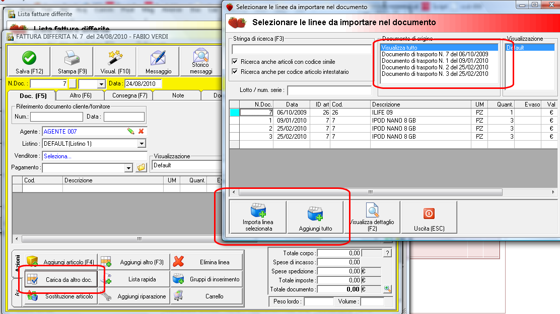 All'interno della fattura differita, premendo su "Carica da altro documento", si apre la lista dei documenti di trasporto emessi per quel determinato cliente. Da qui puoi importare il ddt che selezioni nel corpo della fattura differita.