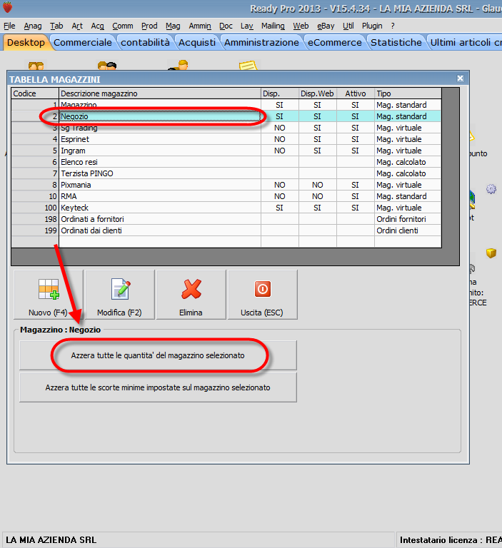 Se intendi portare a zero TUTTO il magazzino (quindi giacenza di TUTTI gli articoli che hai nella lista articoli di Ready) puoi utilizzare il pulsante che ti mostro in figura che trovi nel menu TAB > MAGAZZINI.