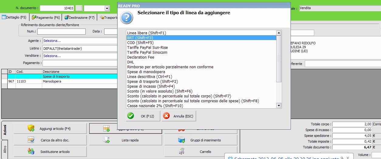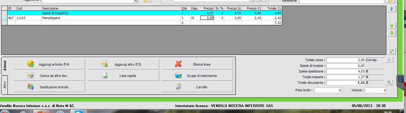 Buonasera, se in un qualsiasi documento inserisco come unica voce quella relativa al trasporto(Che è impostata in automatico a 4,05 + IVA per 4,90 totali), ready mi riconosce imponibile di 4,05 e totale, IVATO, di 4,05, senza aggiungere l’IVA quindi. Per risolvere devo: