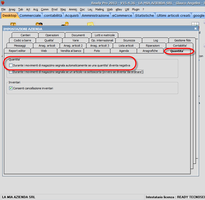 Quello che devi semplicemente fare è "ignorare" le giacenze negative nel tuo magazzino reale che utilizzi per lo scarico degli ordini. Per eliminare il messaggio dove Ready Pro ti mostra le giacenze negative devi disattivare l'opzione indicata in figura che trovi in UTIL > IMPOSTAZIONI AZIENDA > QUANTITA':