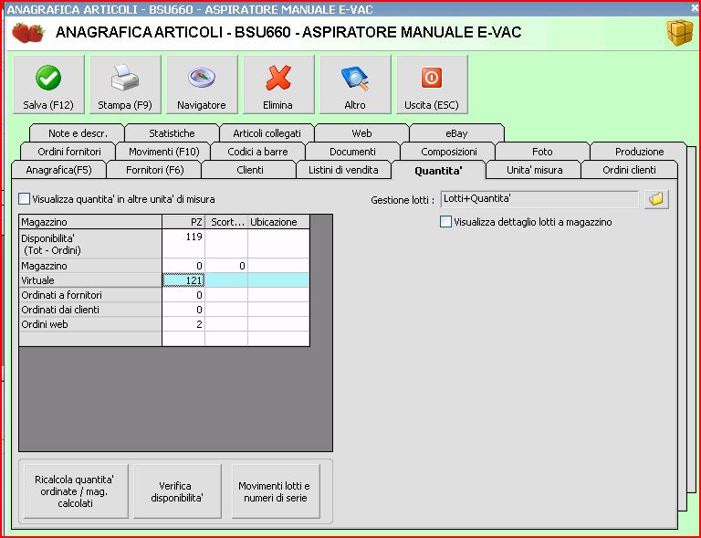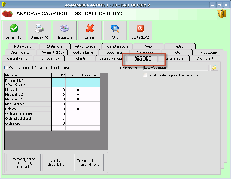 Puoi mostrarci uno screenshot della scheda QUANTITà di quell'articolo e della schermata in TAB / MAGAZZINI ?