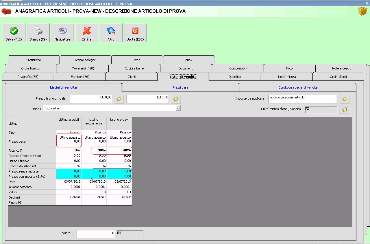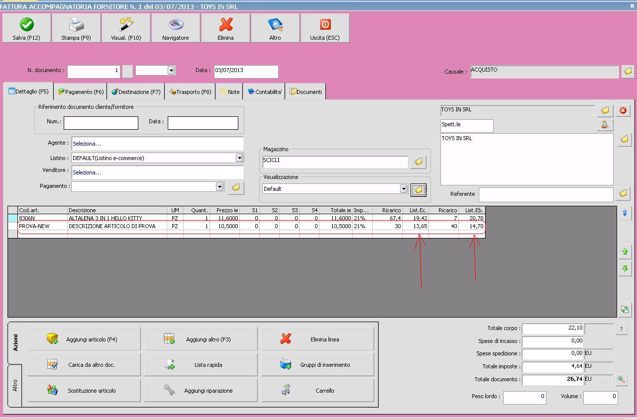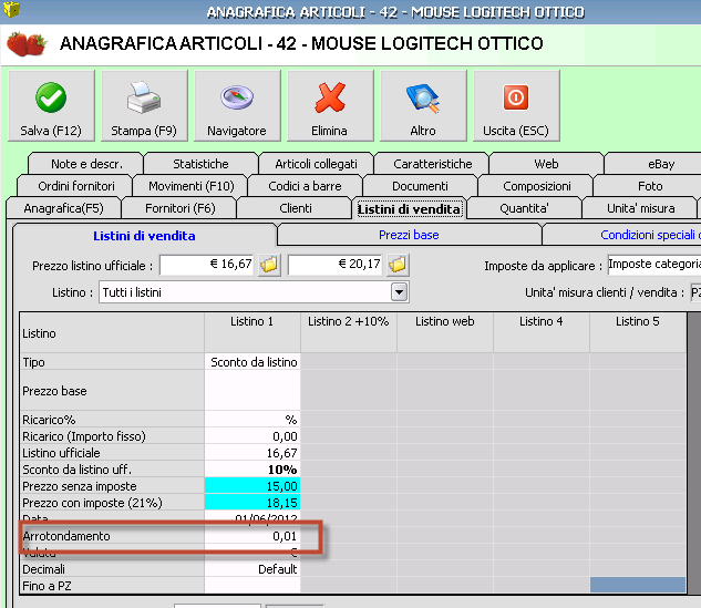 Ready-Pro: V15.4.43 Sistema operativo: Windows 2003 server standard . Quando da una fattura di acquisto si crea un nuovo articolo ed il prezzo devo generarlo dal prezzo di acquisto devo ritornare nell'articolo per completare i prezzi. Cioè, la prima volta me lo creo (impostando la % di ricarica dal prezzo di ultimo acquisto) e, poi, lo richiamo nella fattura di acquisto; la seconda volta devo ritornare nell'articolo dove trovo il prezzo di ultimo acquisto che mi serve per rifinire il prezzo (ad esempio se avevo messo il 30% ed il 40% per 2 listini diversi poi mi serve mettere un prezzo "consono" ossia se il prezzo generato è € 13,65 metterò € 13,90 ad esempio).