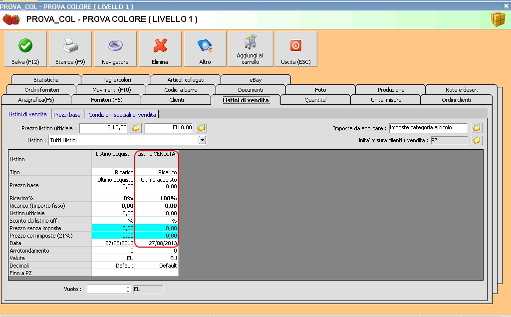 Il problema principale è come impostare un prezzo di vendita in automatico sui prodotti per taglie e colori. Per il poco che abbiamo, nelle matrici impostiamo a mano il prezzo perchè non c'è nessun dato di acquisto. Nelle varianti abbiamo i prezzi di acquisto, ma, il prezzo di vendita è gestito nelle matrici. Con Citazione: copiare il prezzo di vendita della matrice su tutte le varianti non capisco se dici scrivere a mano un prezzo e riportarlo nelle varianti ?!