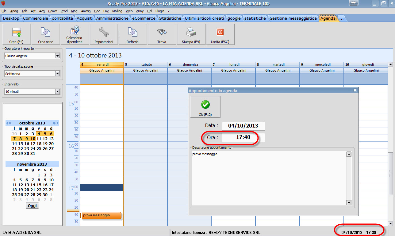 Volevamo utilizzare l'agenda per inserire impegni/appuntamenti per essere avvisati in anticipo. Non riusciamo però o a capire qualche funzionamento-impostazione o c'è qualcosa che non va. Esempio: ore 11.44, inseriamo appuntamento dalle ore 13.00 alle ore 13.30. Nelle impostazione è flagata la voce 'visualizza un avviso in prossimità di...' e in 'minuti di anticipo co cui visualizzare l'avviso' è inserito 1. Ci si aspetterebbe che alle ore 12.59 esca l'avviso ed invece l'avviso esce alle ore 12.00 (orari tutti rilevati da orologio del pc)