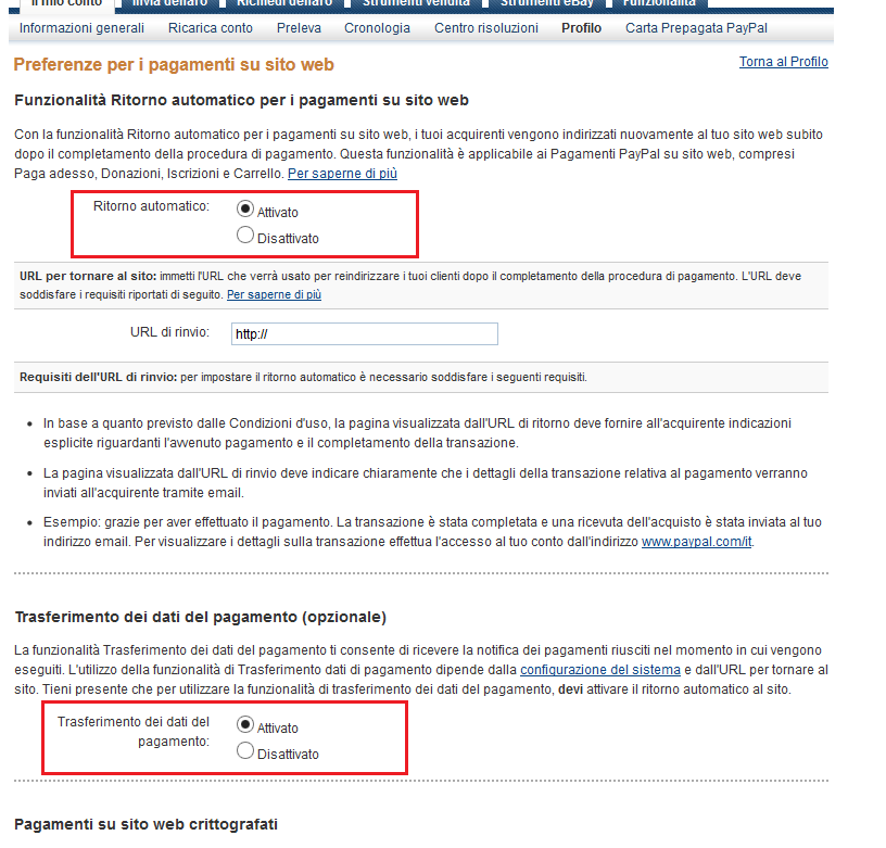 Ciao, mi servirebbero alcuni screenshot del tuo account Paypal. Il primo quello dell'impostazione dell'autoreturn: Dal menu Profilo/Strumenti di vendita/Preferenze per i pagamenti su sito web (vedi screenshot 1)