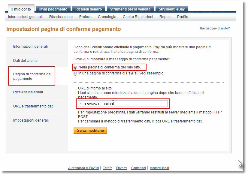 Il secondo dal menu Profilo/Impostazioni dei pagamenti su sito web/Pagina di conferma del pagamento (vedi screenshot 2)