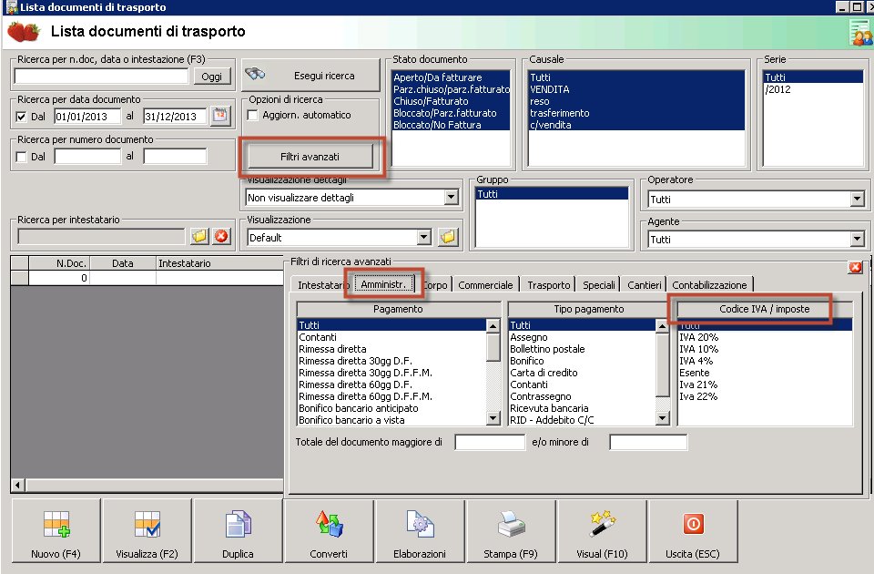I filtri avanzati sono presenti nella parte alta della lista documenti come mostrato in figura