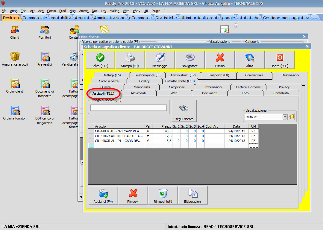 Citazione: come prezzo mi propone sempre il prezzo con 1% di iva aggiunto soltanto negli articoli che in precedenza un cliente ha acquistato Apri l'anagrafica di quel cliente e verifica se ha dei prezzi fissi indicati nel tab ARTICOLI: