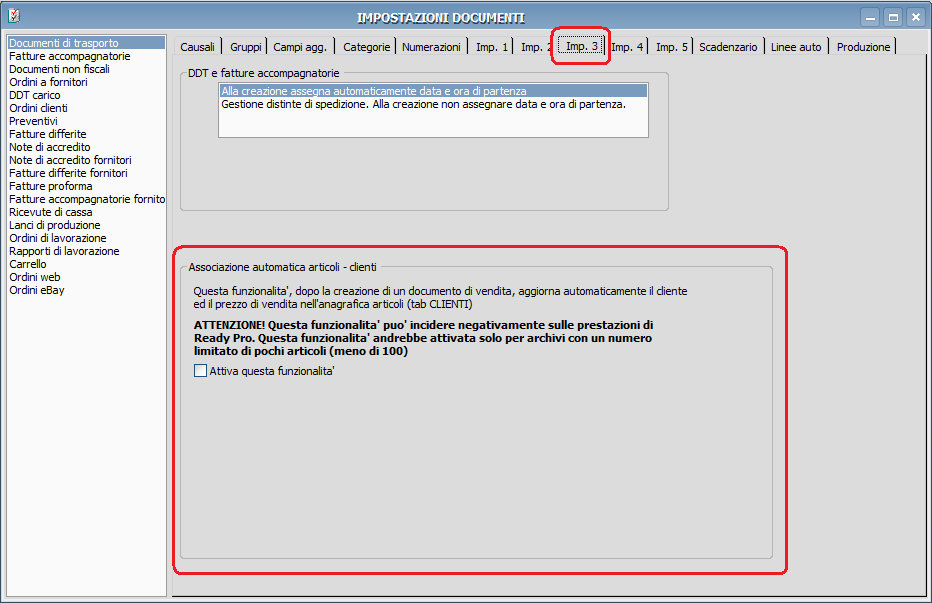 Queste linee gialle indicano che e' stato attivato da UTIL / IMPOSTAZIONI DOCUMENTI l'automatismo evidenziato. Il consiglio e' di disattivare l'opzione, anche perche' con molti articoli/clienti, come nel vostro caso, e' fortemente sconsigliato l'utilizzo di questo automatismo (come indicato anche di fianco all'opzione stessa)