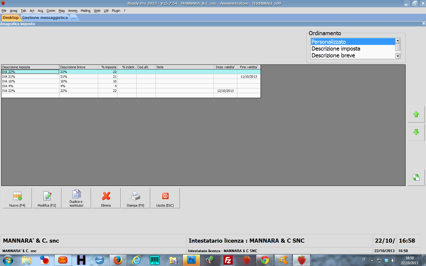Vanno sicuramente corrette un paio di cose: - La data di fine validità per l'IVA 21% è da impostare come 30.09.2013 - La data di inizio validità per l'IVA 22% è da impostare come 01.10.2013 - La prima linea con indicato IVA 22% è quella che hai quasi sicuramente creato tu manualmente, quindi va eliminata.