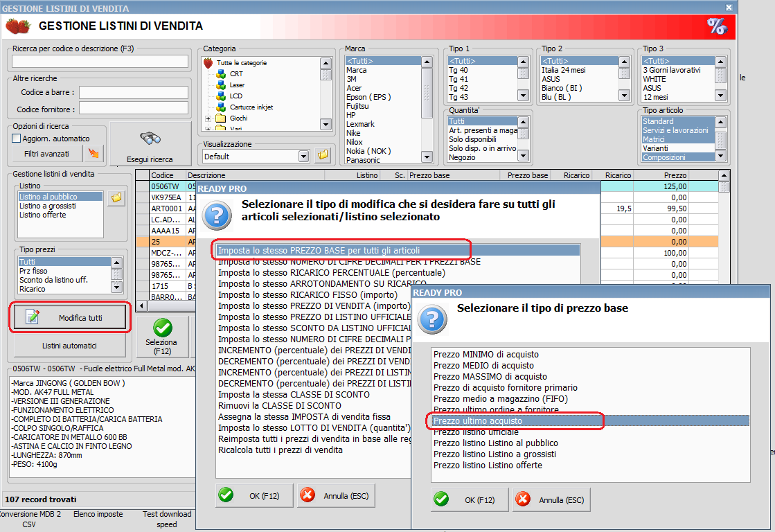 1. Menù Articoli -> Listini di vendita 2. Elaborazioni 3. Filtri Avanzati: Seleziono Fornitore 4. Selezione Categoria 5. Seleziono Listino 6. Eseguo Ricerca 7. Seleziono tutti gli articoli 8. Seleziono campo da elaborare "Prezzo Base" con opzione azzera e ricalcola... 9. Elaboro