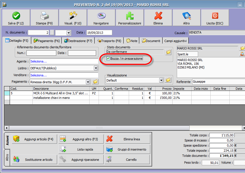 Progetto da fare Potresti creare un preventivo con una bozza di articoli/linee libere indicative del progetto. Imposti lo stato in BOZZA come mostrato in figura: