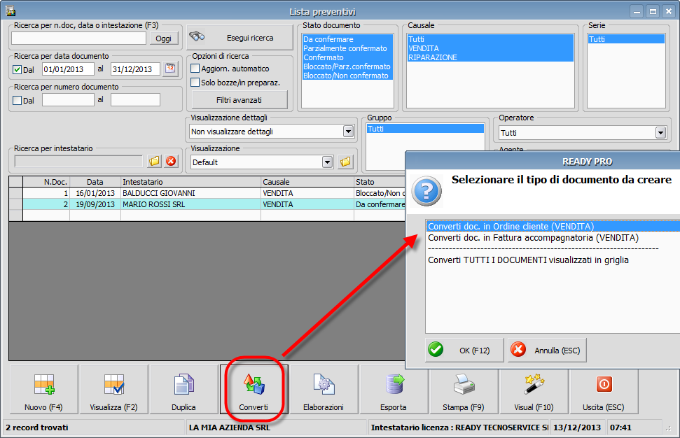 Esempio: -Si puo' configurare Ready Pro in modo che solo gli ordini con causale IN PRODUZIONE, sia convertibile in fattura. In questo modo un ordine con causale PROGETTO DA FARE non sarebbe mai convertibile in fattura per errore.