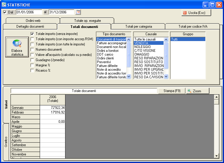 Da Ammin/Statistiche hai la possibilita' di fare il calcolo dei totali per tipo documento, per causale, per categoria, ecc. Ad esempio nell'immagine e' stato calcolato il totale per mese dei documenti di trasporto con causale ACQUISTO E' sufficiente fare la stessa cosa per gli altri tipi di documenti che vengono utilizzati (ad es. fatture accompagnatorie e ricevute di cassa) e fare la somma. Con il tasto destro del mouse puoi riportare i totali su Excel con due click se ti e' piu' comodo. Idem per gli acquisti. Non c'e' ancora una procedura che fa tutto in automatico perche' ogni cliente utilizza causali e tipi di documenti diversi per l'acquisto e la vendita