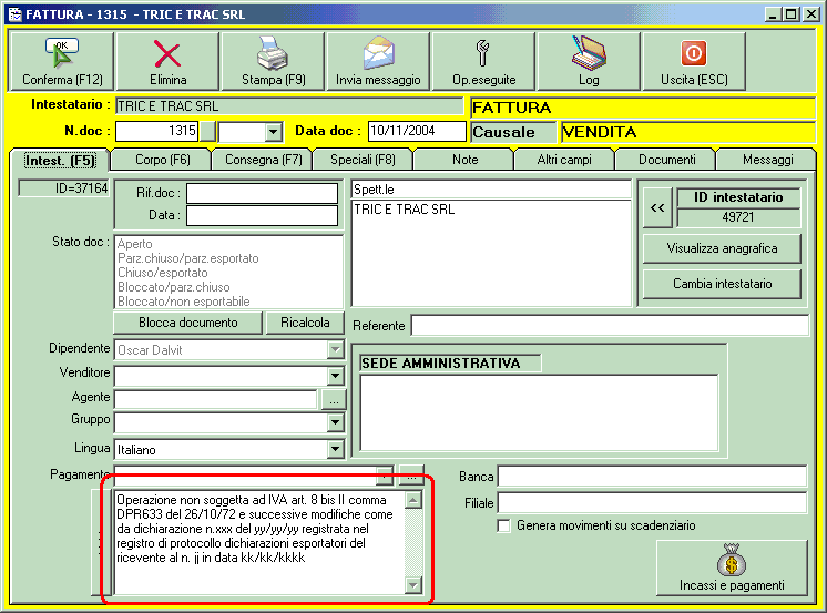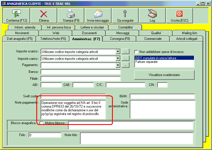 Per esempio si potrebbe indicare la dicitura "Operazione non soggetta ecc. ecc." nel campo note pagamento all'interno dell'anagrafica clienti (vedi schermo1.gif). Al momento della creazione di un nuovo documento (ordine, ddt, fattura, ecc.) questo campo viene automaticamente riportato sul campo corrispondente (schermo2.gif) e modificando opportunamente il modulo di stampa con il report editor e' possibile chiaramente stamparlo in fattura.